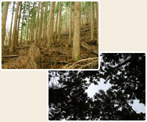 下の写真のように間伐が遅れると、ひょろ長い木になってしまい 風害、雪害で折れてしまうことがあります。