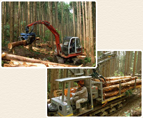 搬出の方法としては、架線集材と、作業道を開設し高性能林業機材で搬出する方法があります。