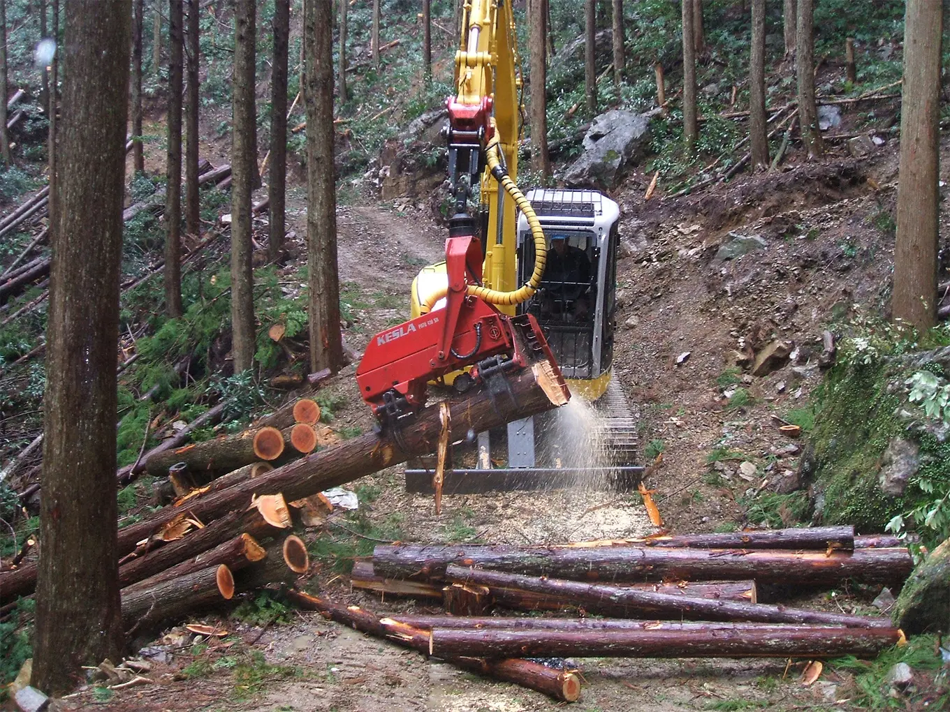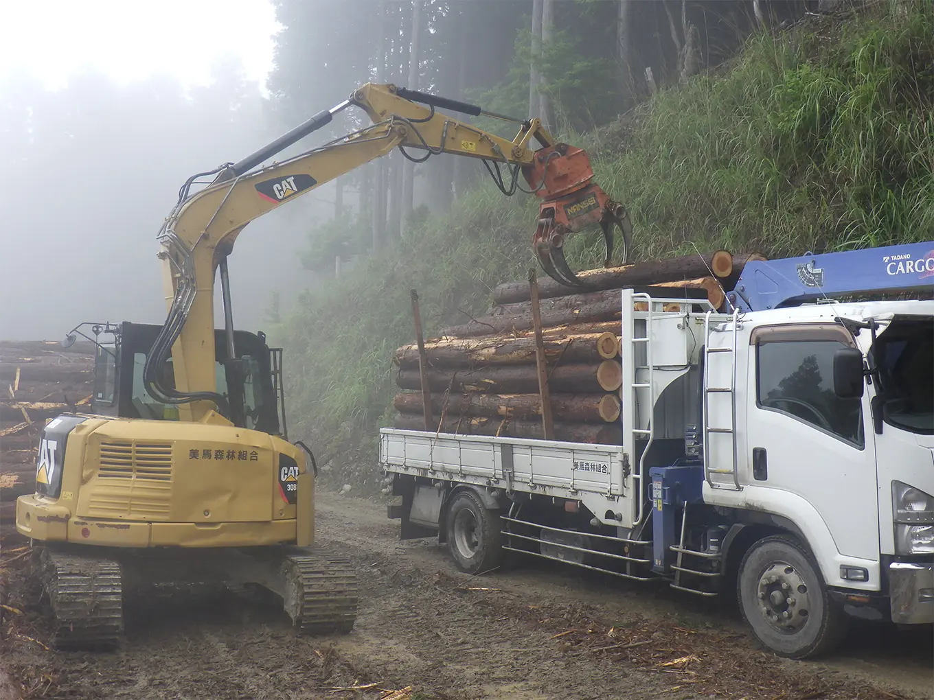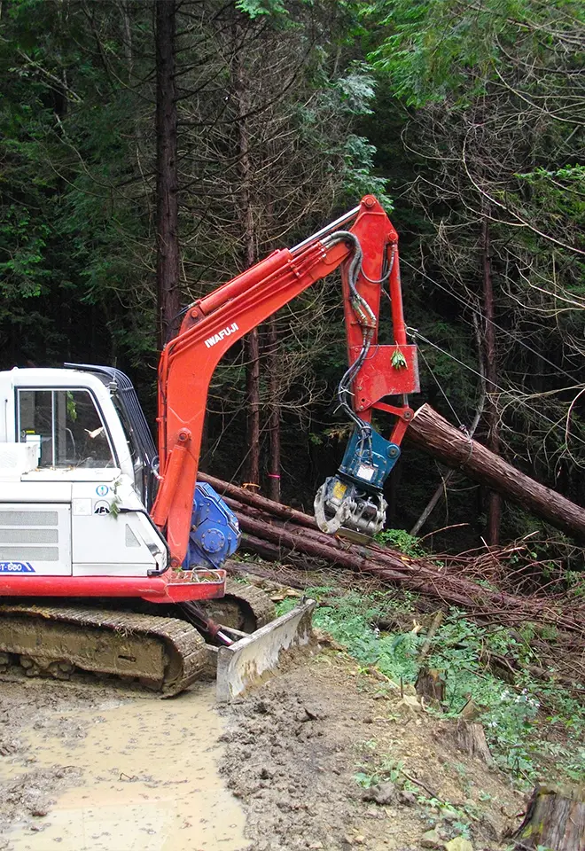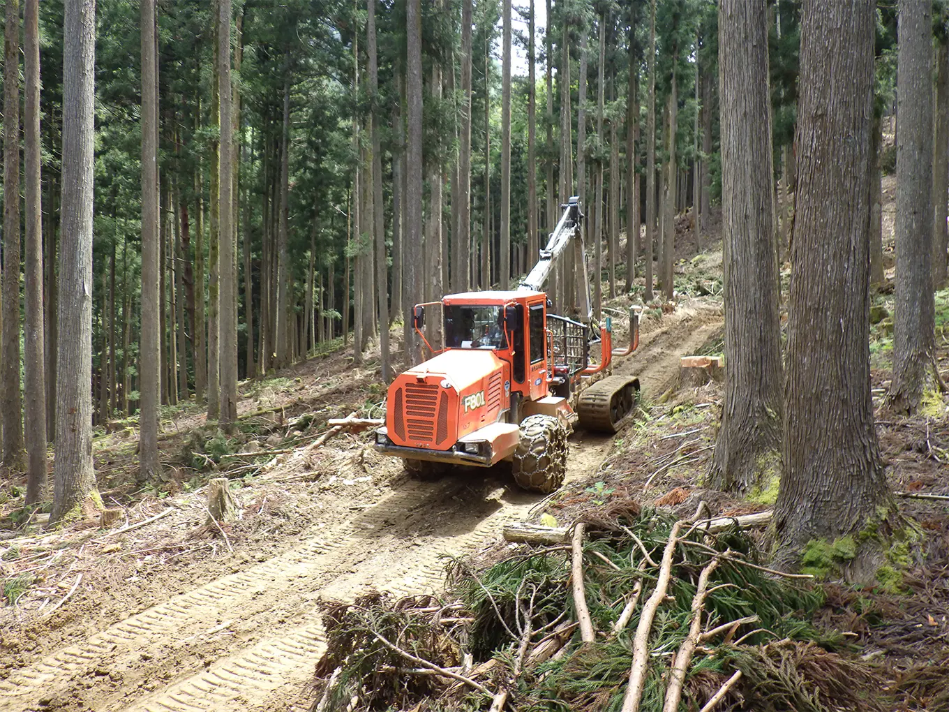 高性能林業機械を操り、作業道を利用して木材の伐採・搬出を行います。
